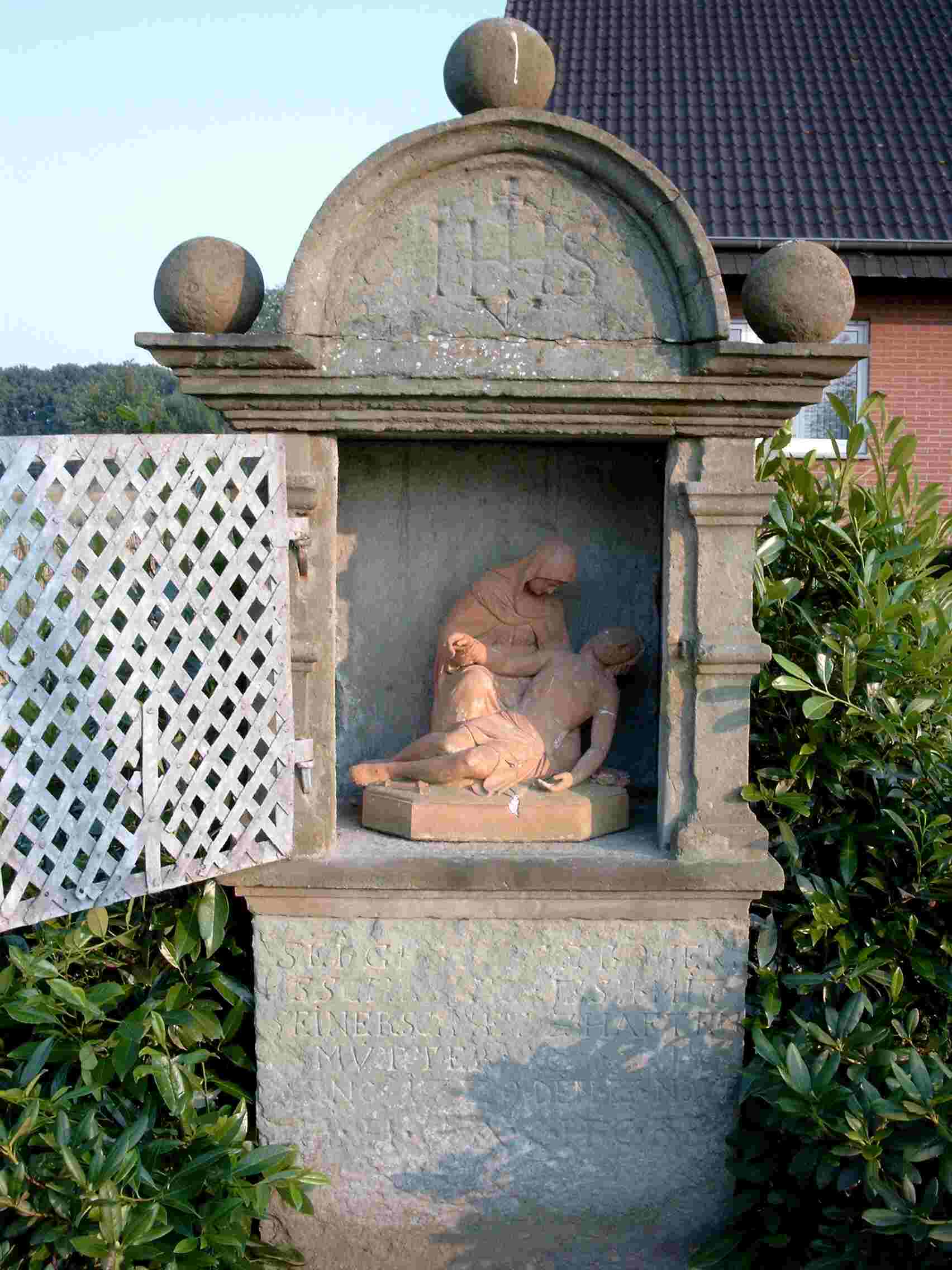 Es handelt sich um ein Heiligenhäuschen mit Vesperbild.Das Heiligenhäuschenaus Sandstein zeigt die lateinische Inschrift:Deo trino et uni (dem dreieinigen Gott) Anno 1705 den 20.Aprilis.Das ist derTag der Einweihung des Bildstocks.Wie schon aus der Jahreszahl ersichtlich,haben wir es mit einer Arbeit des Barock zu tun.Dieser Stil hatte –aus dem Geiste der Gegenreformation geboren –von Süden her inzwischen auch im Fürstbistum Münster Eingang und Verständnis gefunden.Doch haben die Bewegten formen des Südens bei uns –unserer Mentalität entsprechend –gewisse Versachlichung erfahren.