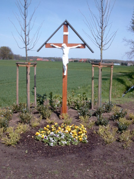 Dieses Kreuz wurde 1993 aus privatem Intresse und als Beweißdafür wie nah man dem Glauben noch ist von Lotte Schulze Bomke aufgestellt.Als zweiter Grund sollte dieses Kreuz ein Ersatz für ein Kreuz sein welches in der Nähe des Hofes gestanden hat und durch die Flurbereinigung in den 60er Jahren weichen mußte.Das Kreuz und der Korpus sind aus Eichenholz gefertigt.Ferner besitzt es ein hölzernes Dach mit Brettern dahinter.Rund um das Keuz sind Blumen und Stäucher gepfanzt.